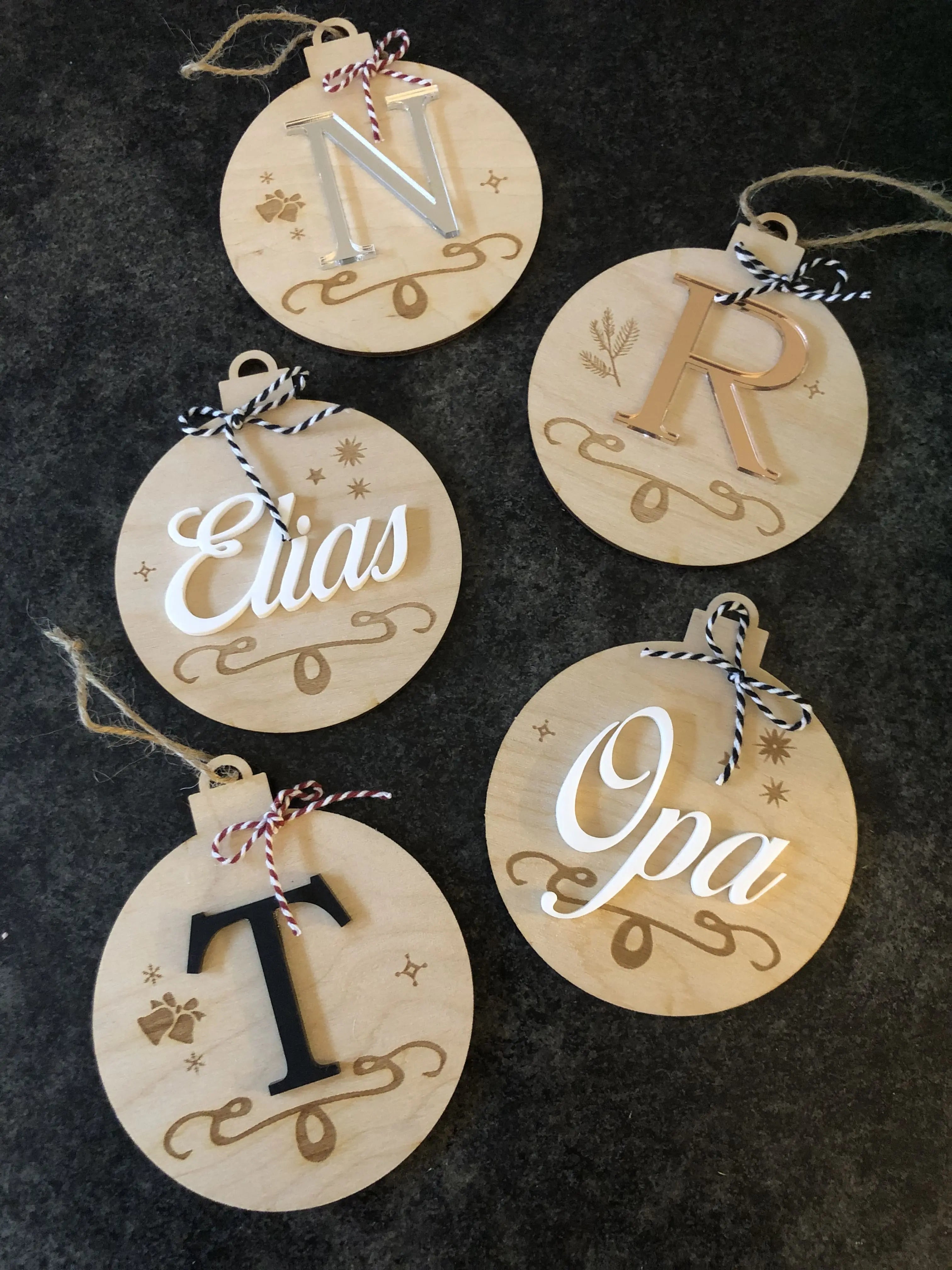 Personalisierte Weihnachtskugeln mit Anfangsbuchstaben oder Namen – festliche Dekoration in  Holz und Acryl