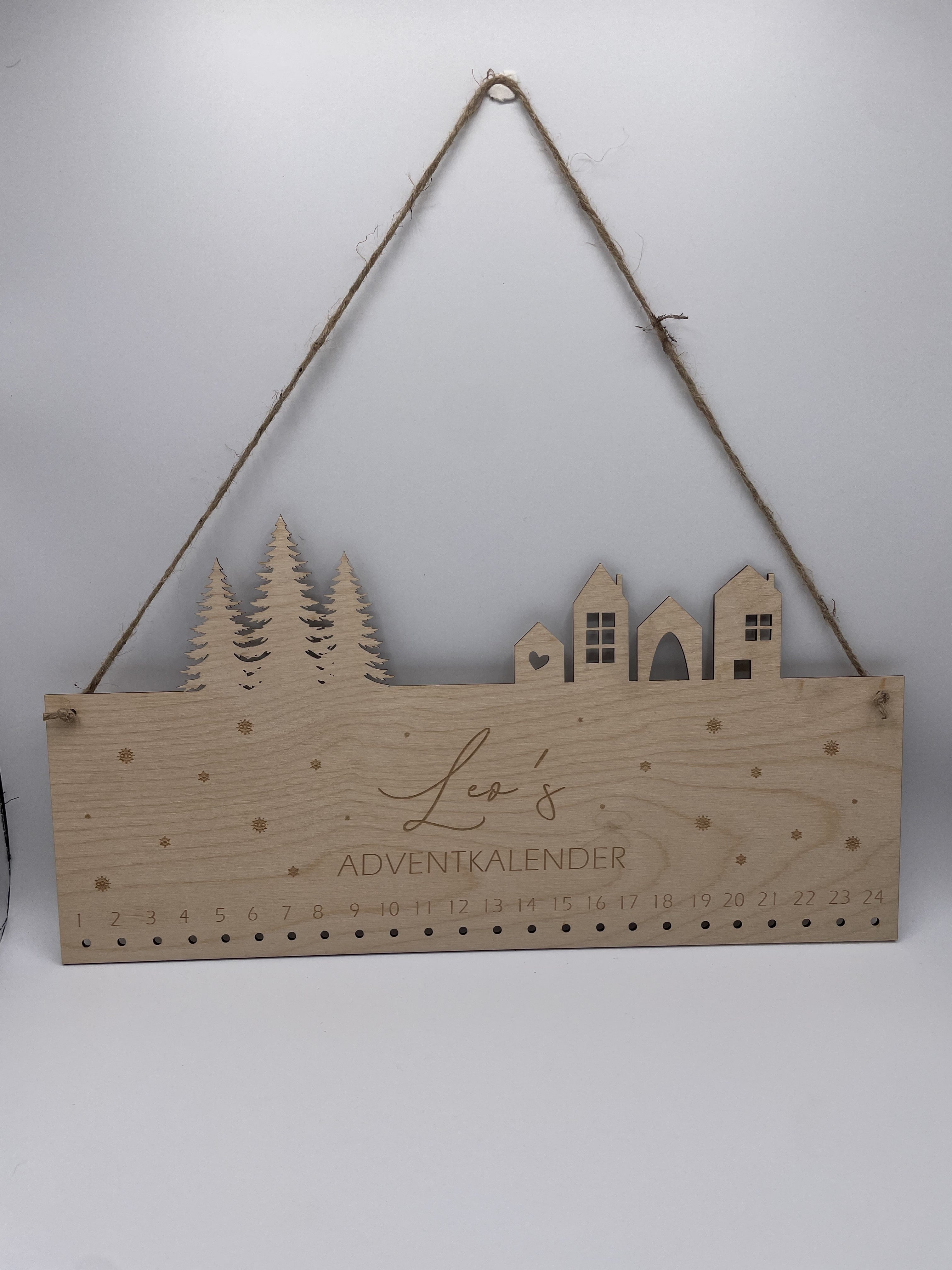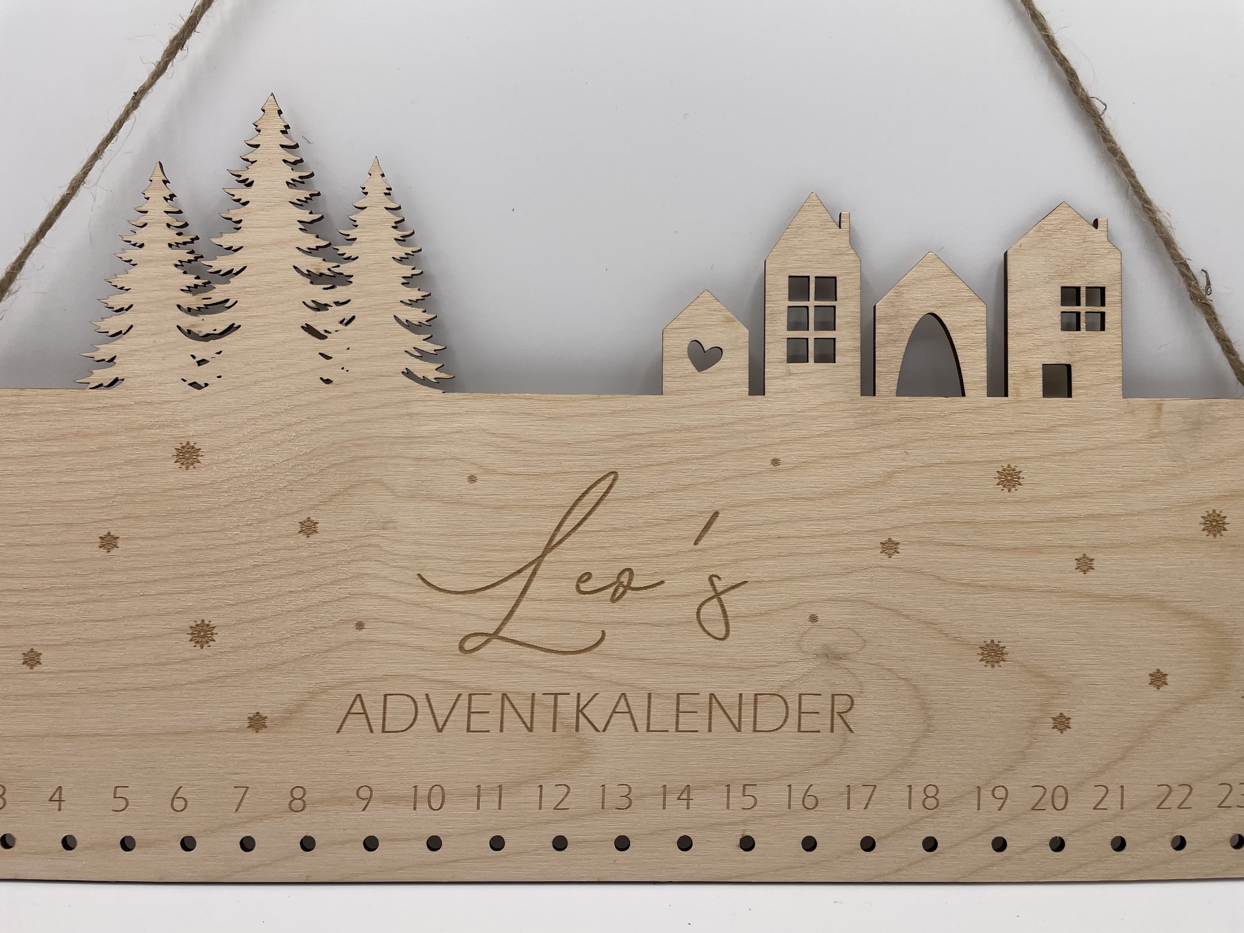 Dieser stilvolle Adventskalender aus hochwertigem Holz ist die perfekte Lösung für alle, die eine persönliche und wiederverwendbare Alternative suchen. Mit einer Breite von 40 cm bietet er 24 nummerierte Löcher, in die du kleine Geschenke oder Anhänger befestigen kannst. Jeder Platz hat einen Durchmesser von ca. 4 mm, ideal für individuelle Befüllungen. Der Kalender besticht durch ein liebevoll graviertes Design mit Wald- und Dorfmotiven sowie der Option, ihn mit einem Namen zu personalisieren.