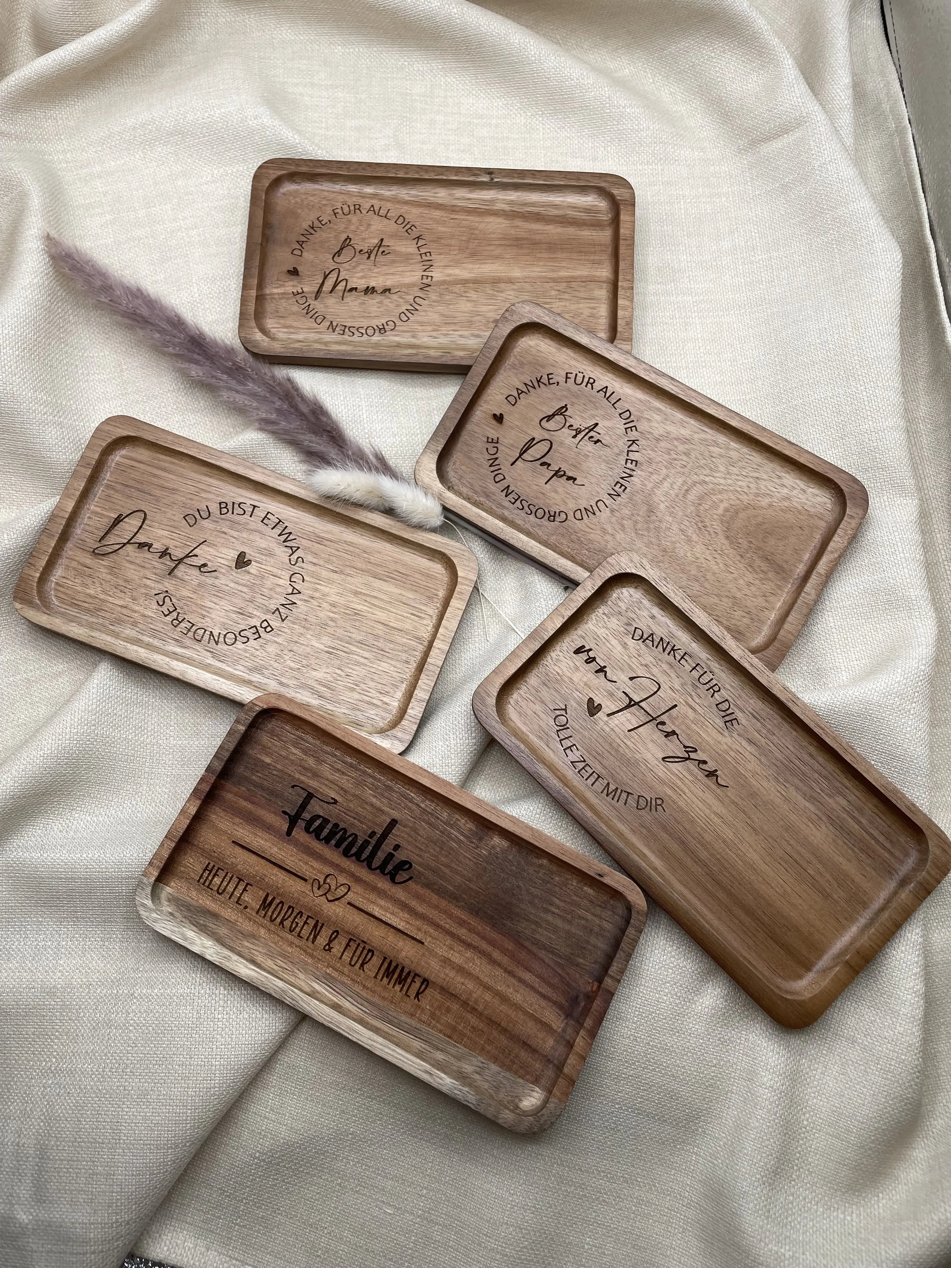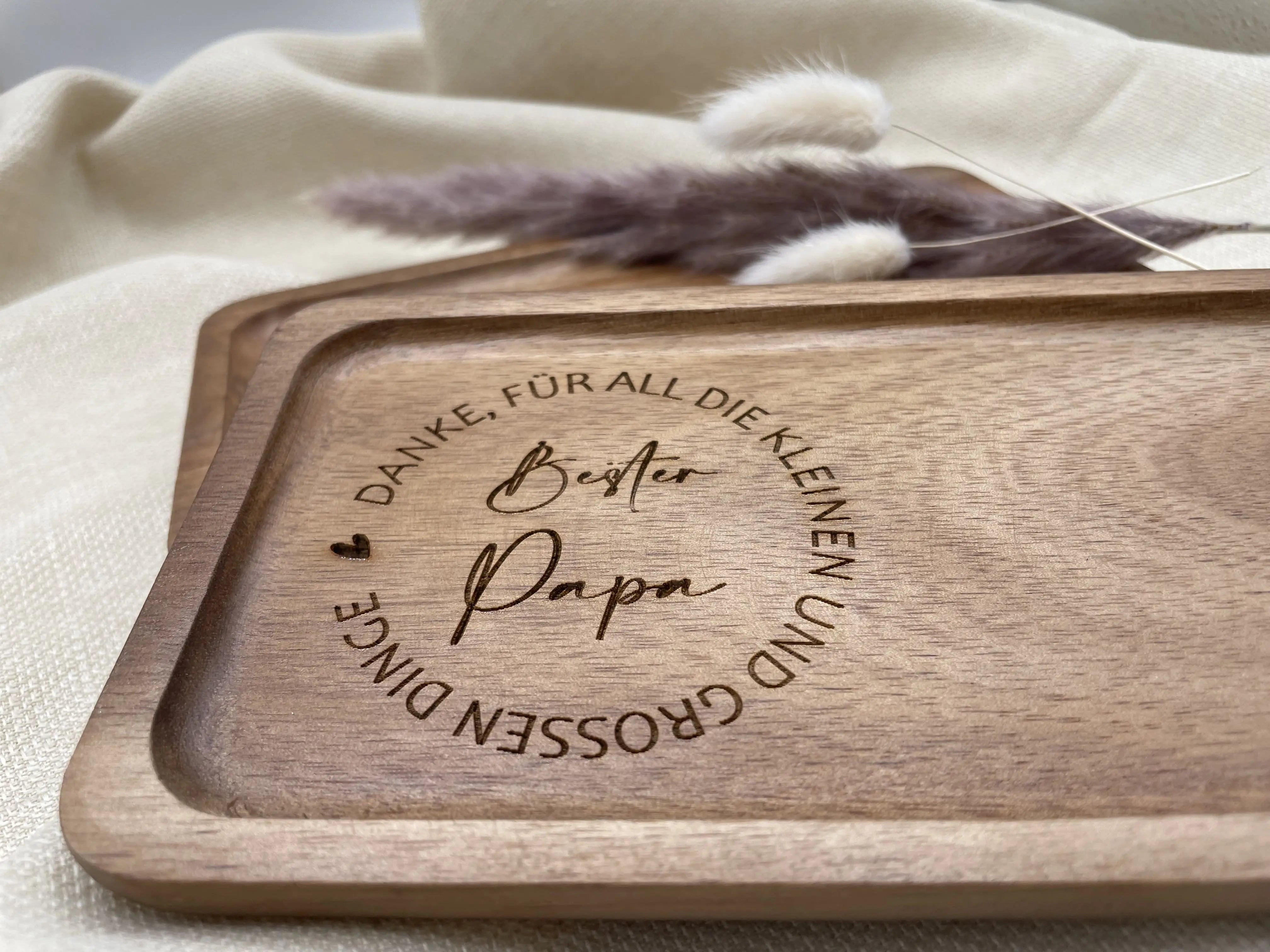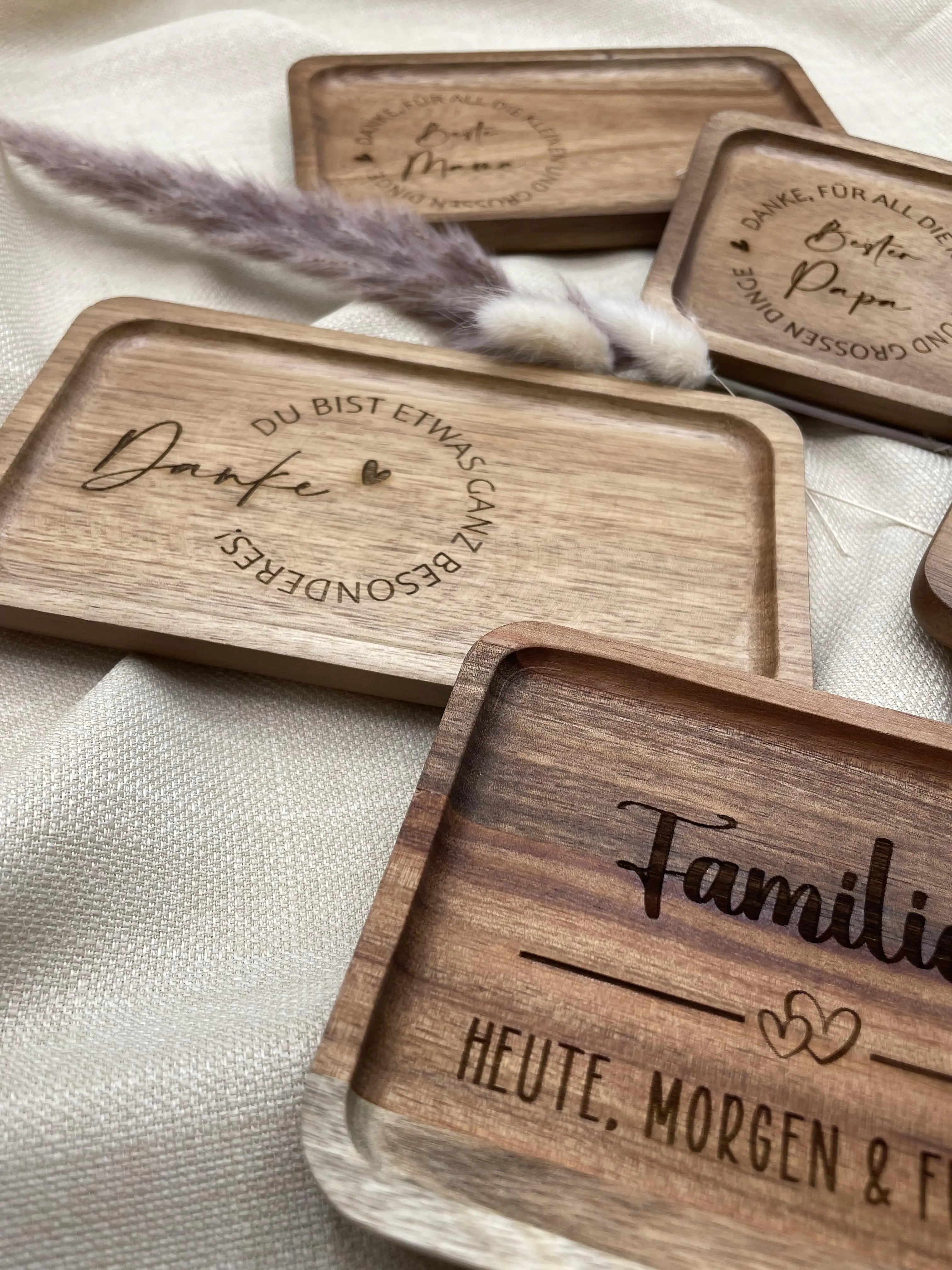 Auf Wunsch kannst du das Minitablett mit einem Namen personalisieren und es so zu einem ganz individuellen Geschenk machen. Perfekt als kleine Aufmerksamkeit zum Geburtstag, Muttertag, Vatertag oder einfach, um "Danke" zu sagen!