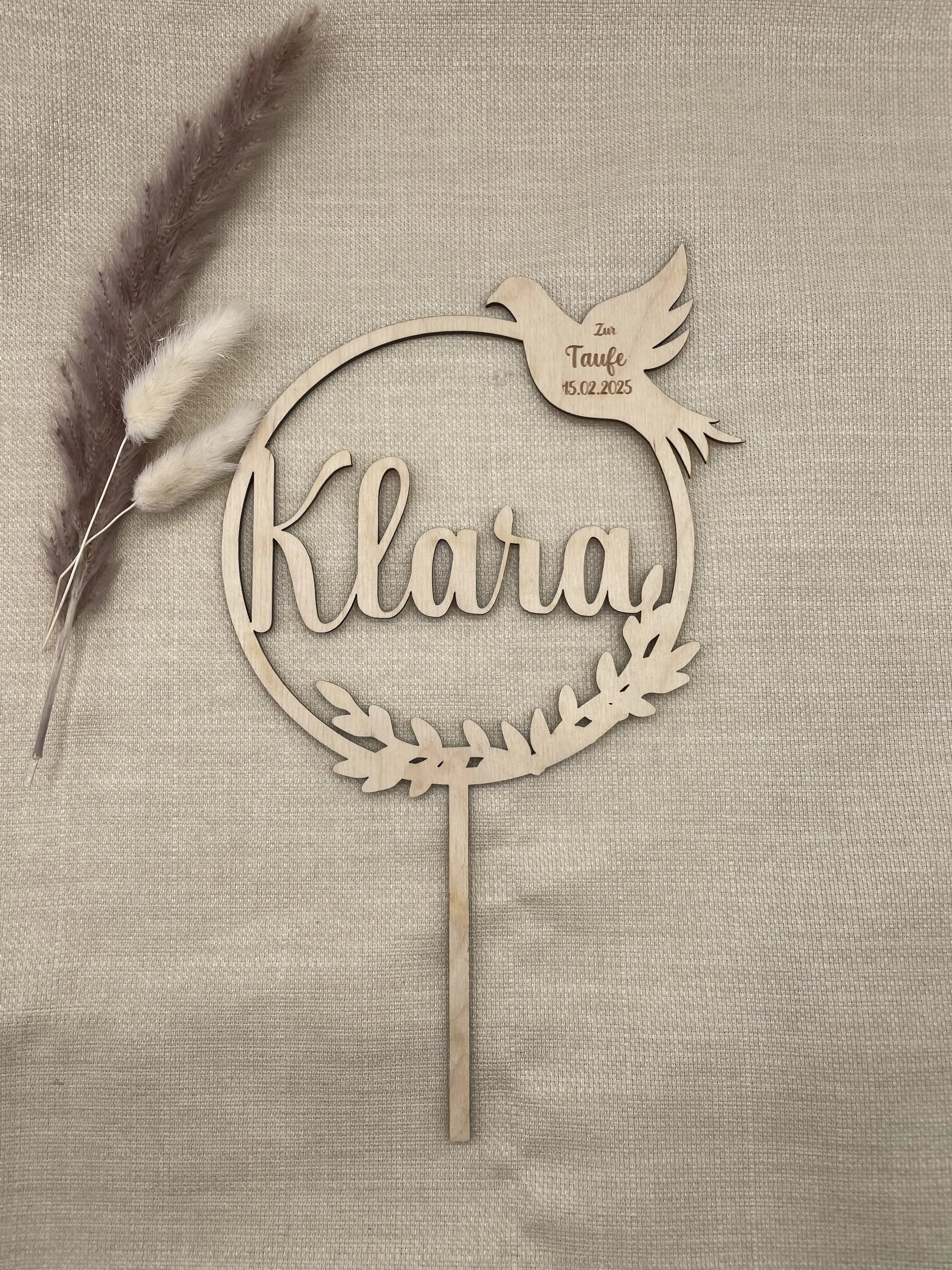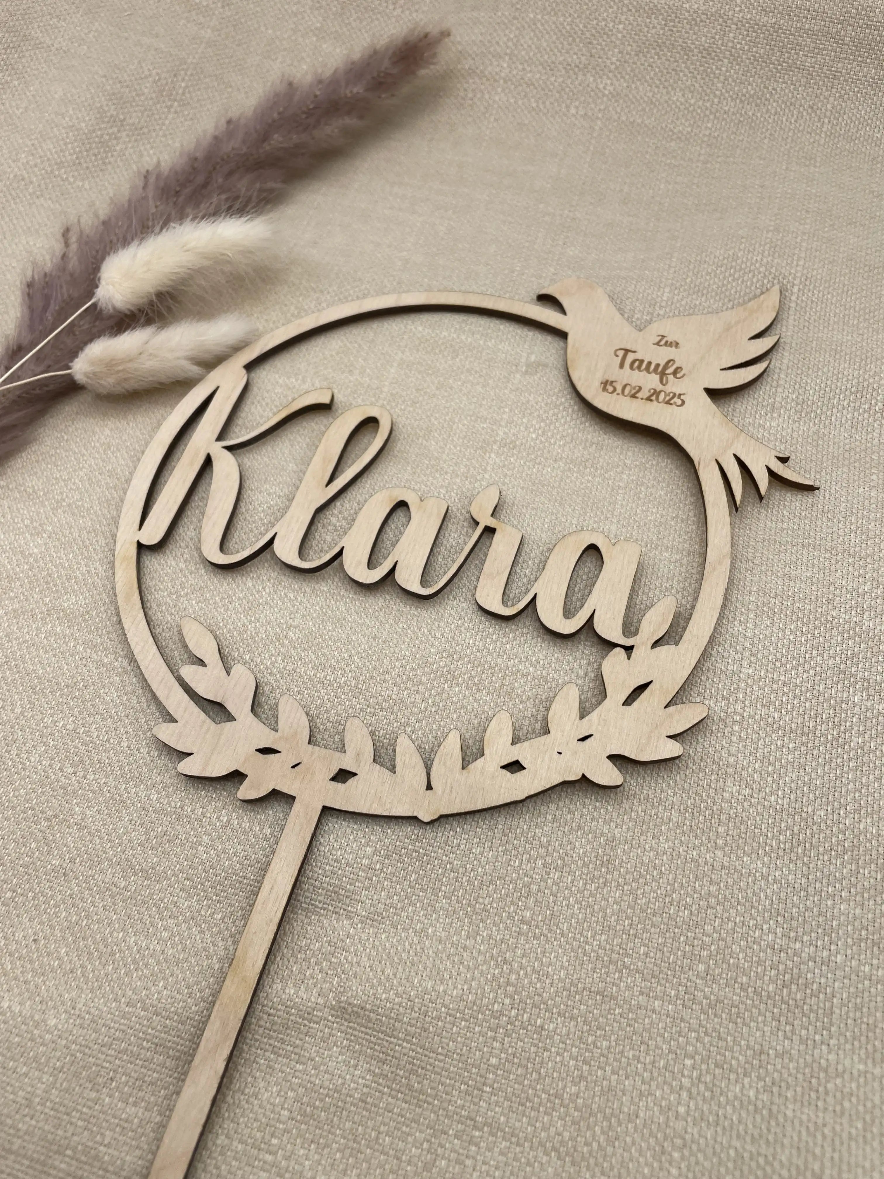 Dieser liebevoll gestaltete Tauftopper aus hochwertigem Holz ist das perfekte Highlight für jede Taufdekoration. Mit einem individuell gravierten Namen, einer zarten Blätterranke und einer eleganten Taube symbolisiert er die Einzigartigkeit dieses besonderen Tages. Das Taufdatum kann ebenfalls eingraviert werden, um eine persönliche Note zu verleihen und den Moment für immer festzuhalten.
