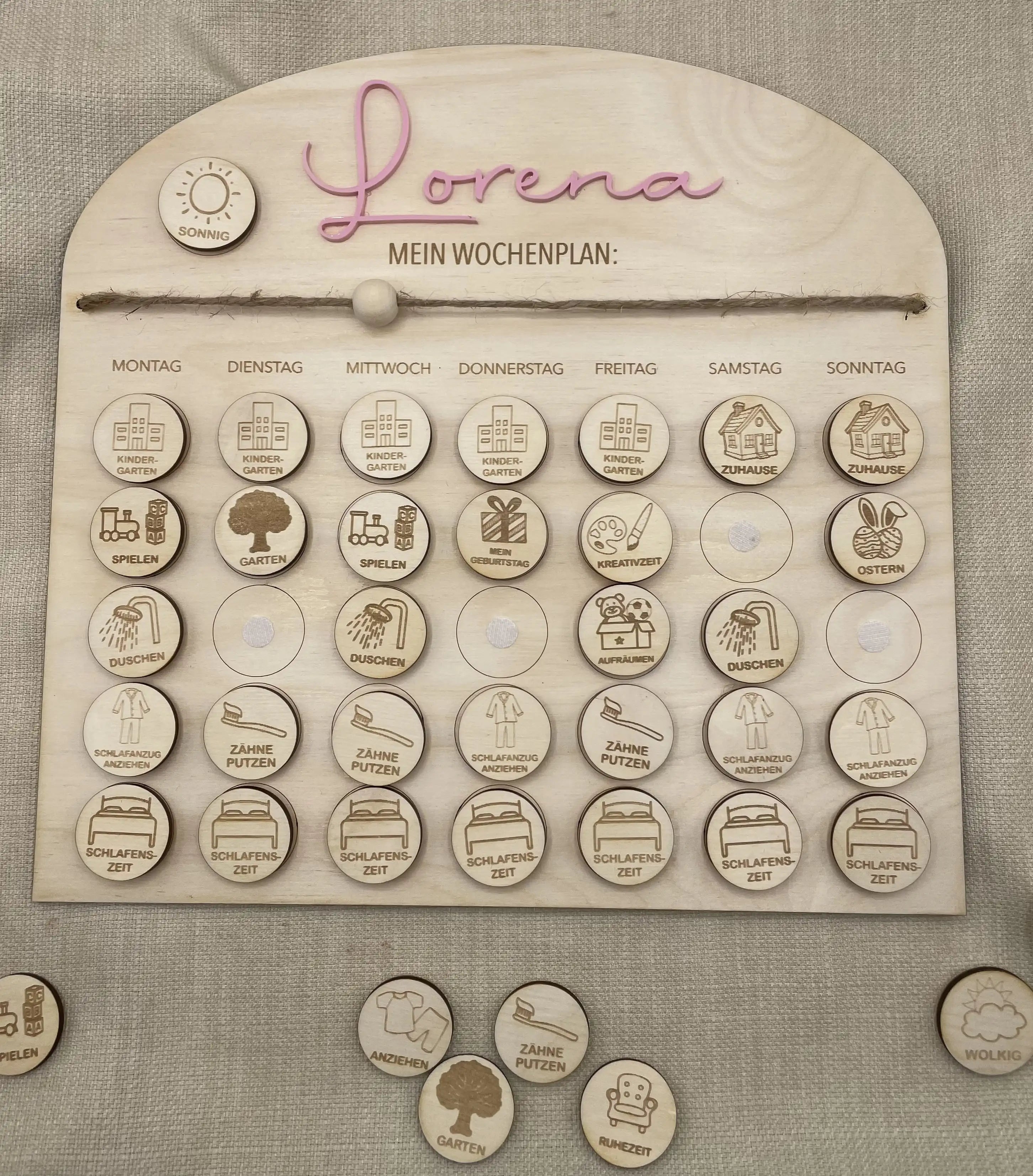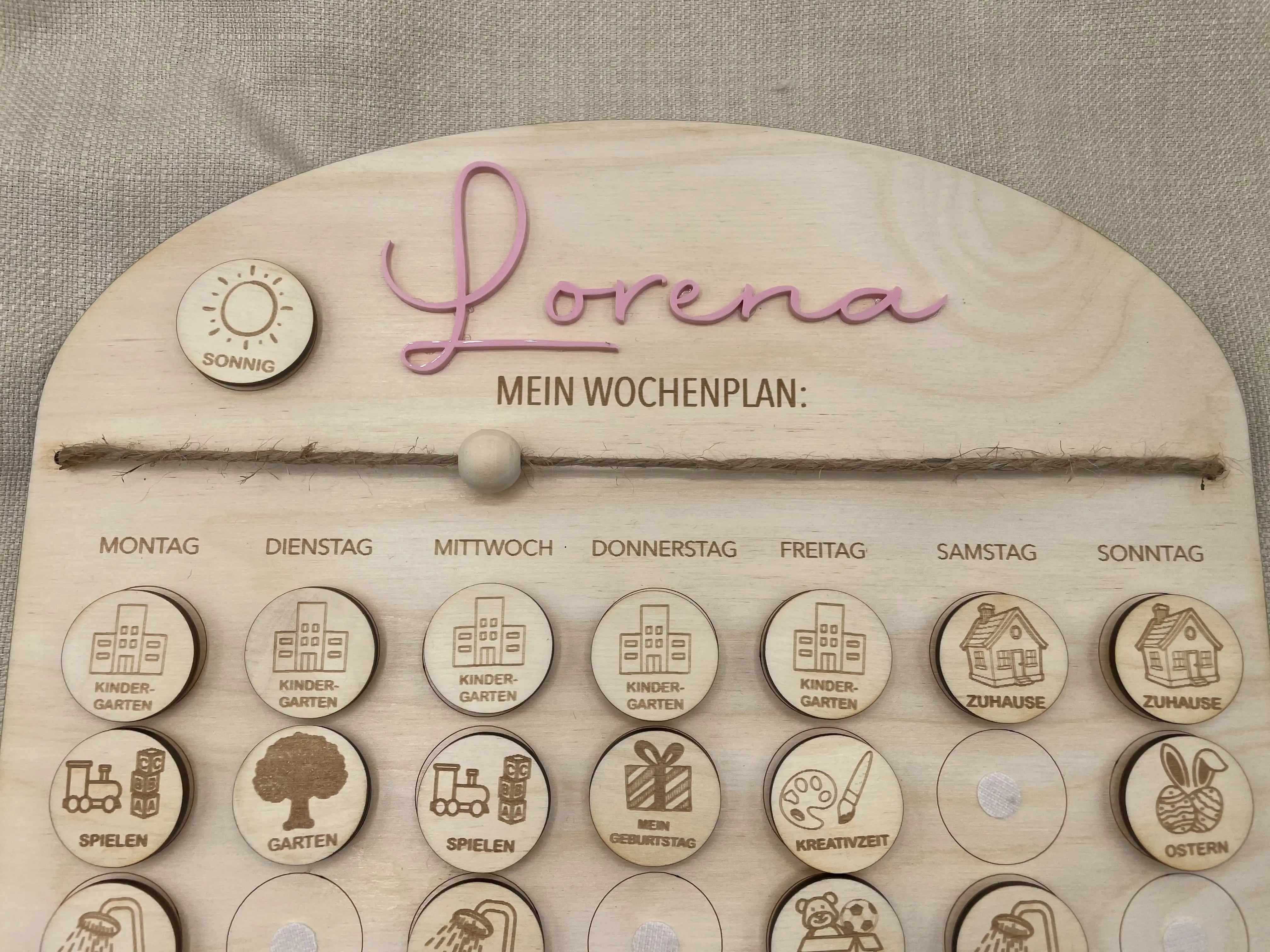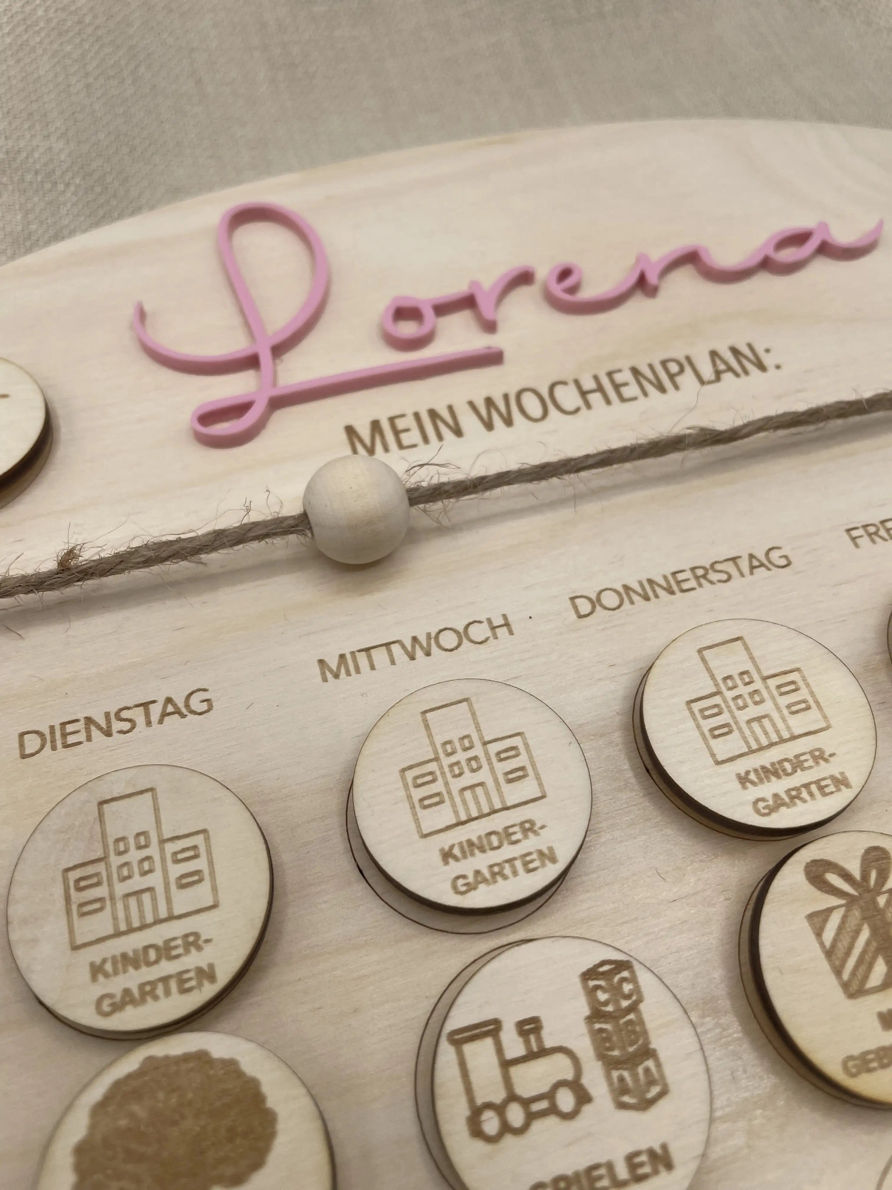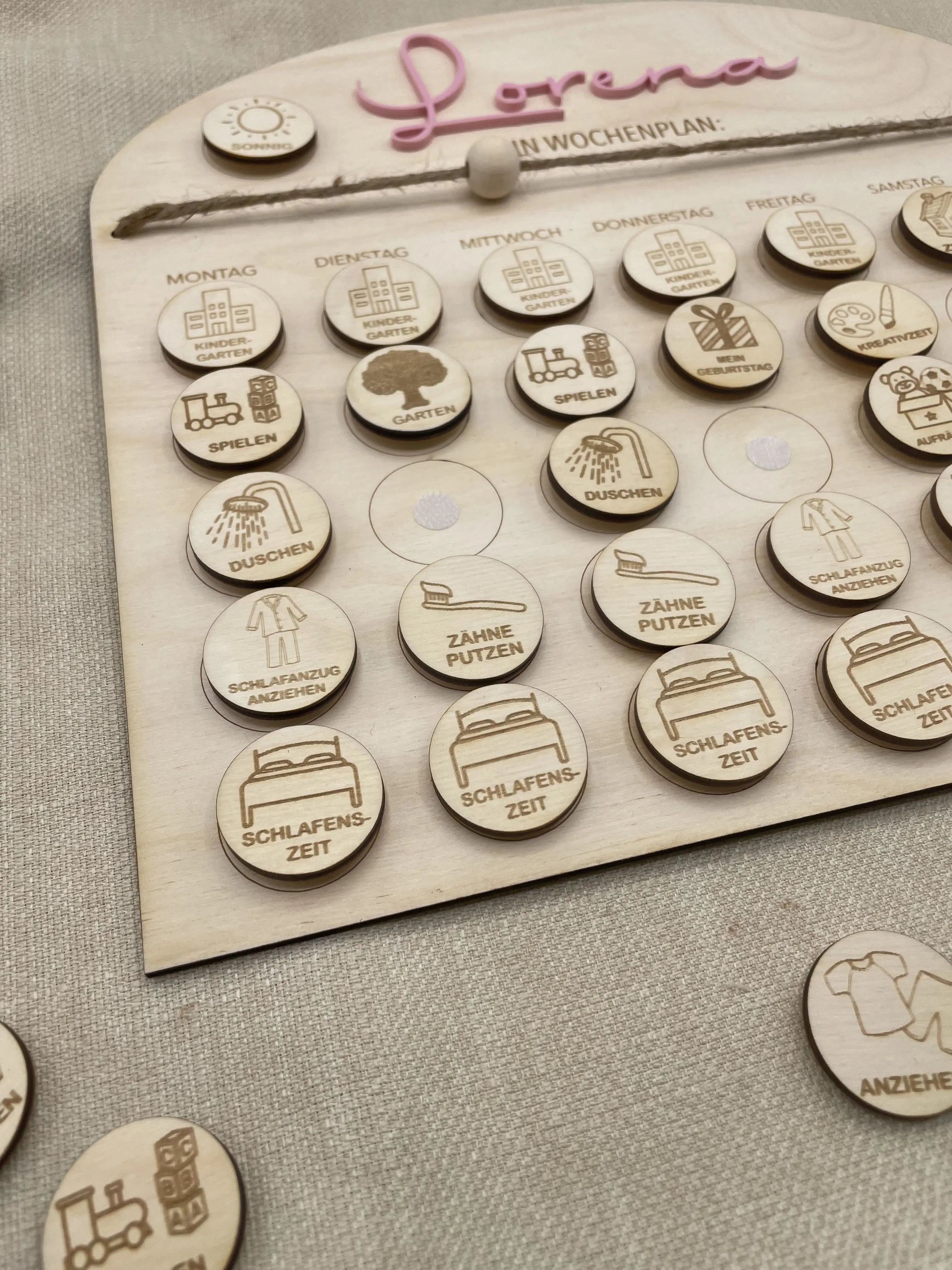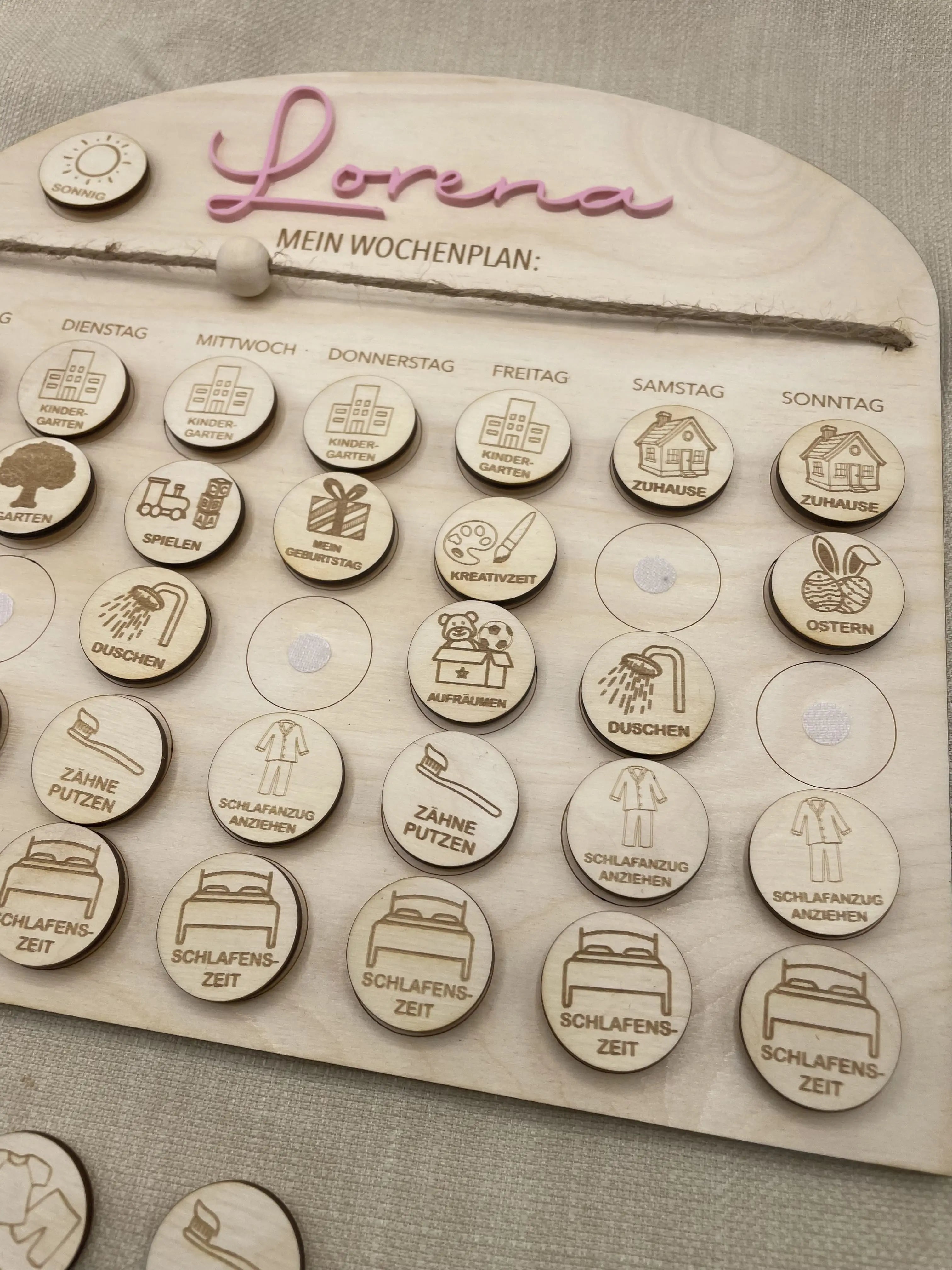 Mit diesem liebevoll gestalteten Wochenplan für Kinder aus Holz bringst du Struktur, Spaß und Übersicht in den Familienalltag – perfekt geeignet, um deinem Kind spielerisch den Tagesablauf und wichtige Ereignisse näherzubringen.