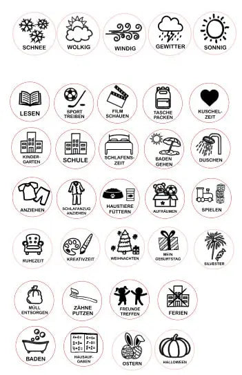 - 20 weitere Aktivitätenscheiben frei wählbar (z. B. Zähne putzen, Spielzeit, Sport, Schlafenszeit …)