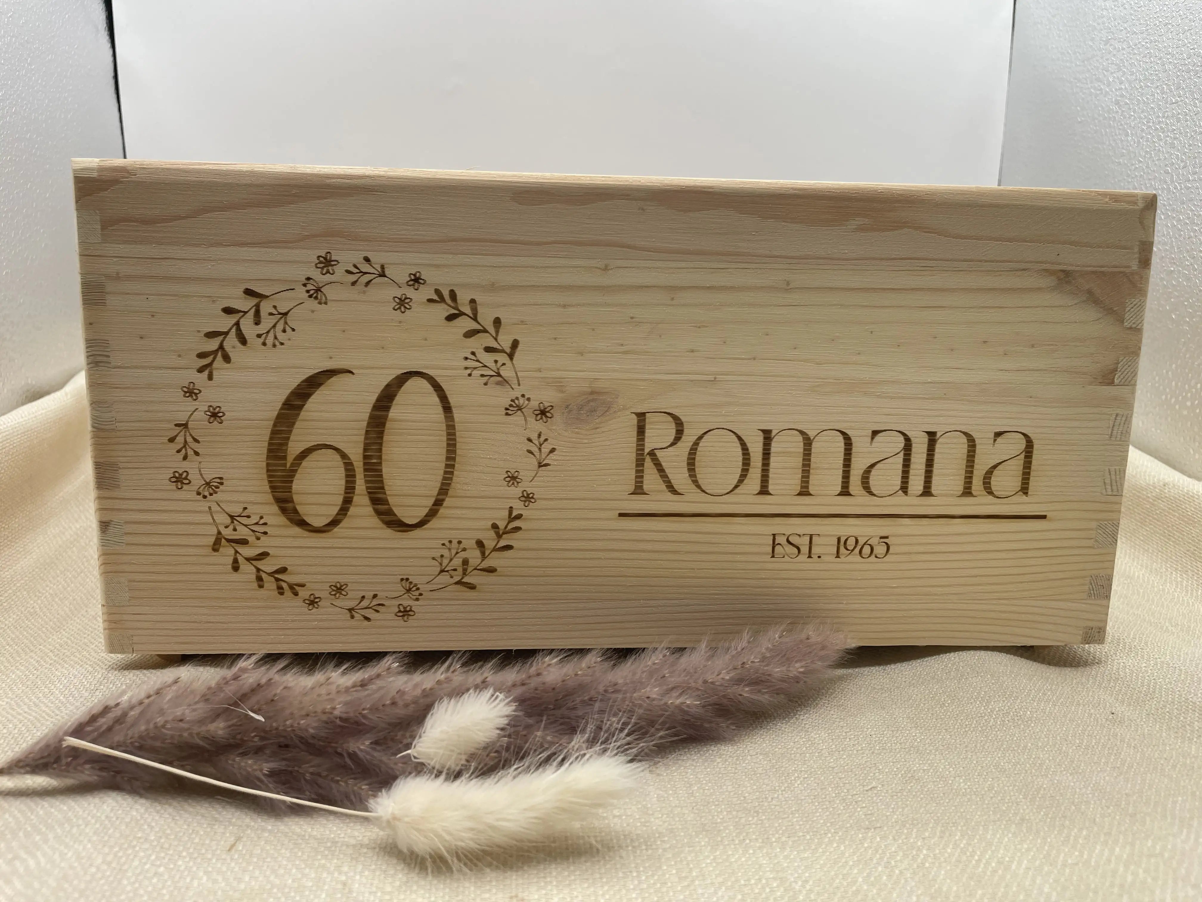 Personalisierte Geburtstagskiste „Blumenkranz“ aus Holz – mit Name, Alter & Jahrgang graviert